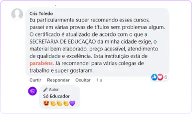 Demonstre sua experiência e compromisso com a qualidade do ensino. Os certificados da Sóeducador são emitidos pela Faculdade FAMEC, instituição credenciada ao Ministério da Educação - MEC. Possuem Autenticidade própria e são reconhecidos Nacionalmente com a mesma validade de certificados presenciais. Destaque-se da multidão e aprimore seu currículo com certificados de até 360 horas e treinamento especializado em áreas estratégicas da educação.
